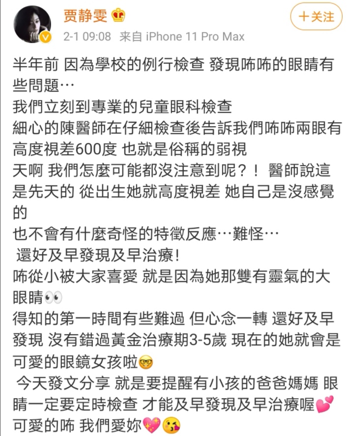 贾静雯女儿咘咘患先天弱视 两眼相差600度 戴眼镜也遮不住高颜值 贾静雯 新浪新闻